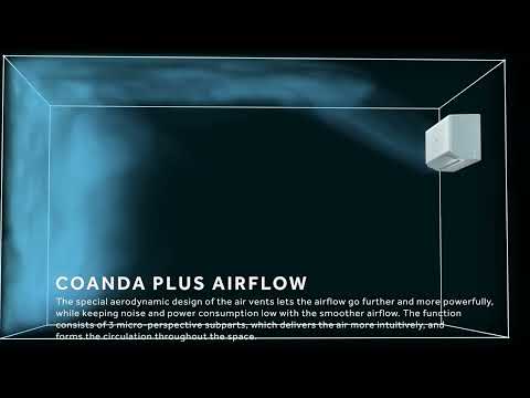 Технологія Coanda Plus забезпечує потужний повітряний потік, здатний досягати найвіддаленіших куточків приміщення, завдяки чому досягається рівномірний розподіл температури та забезпечується додатковий комфорт для користувача.